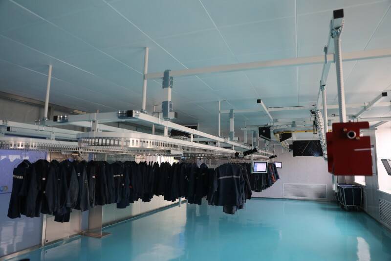 该公司洗衣房升级后,最快两小时就能完成清洗、甩干、熨烫、烘干、分拣、上挂等一整套洗衣流程,每次可同时清洗100公斤的衣物,极大提升了洗衣效率。同时,该公司将洗衣房划分为洗涤、烘干、上挂、暂存区,配置有24小时自助取送服务窗口方便职工随时清洗衣物,下班时送洗,上班时取穿,每天都能穿着干净的工作服下井,进一步提高了职工的幸福指数。