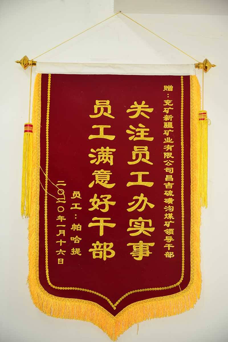 ▲图为硫磺沟煤矿长病维吾尔族职工帕哈提赠送给该矿的锦旗 梁铁 摄