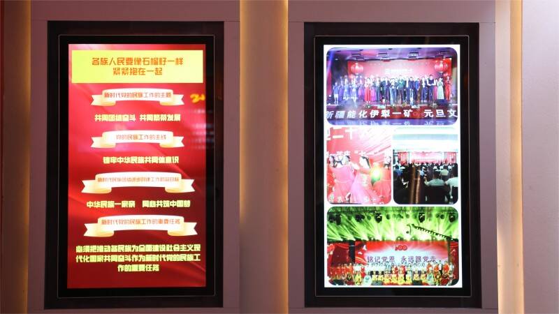 (“天山雪莲”党员初心主题教育基地内循环播放该矿民族团结相关活动剪影 马畅 摄)