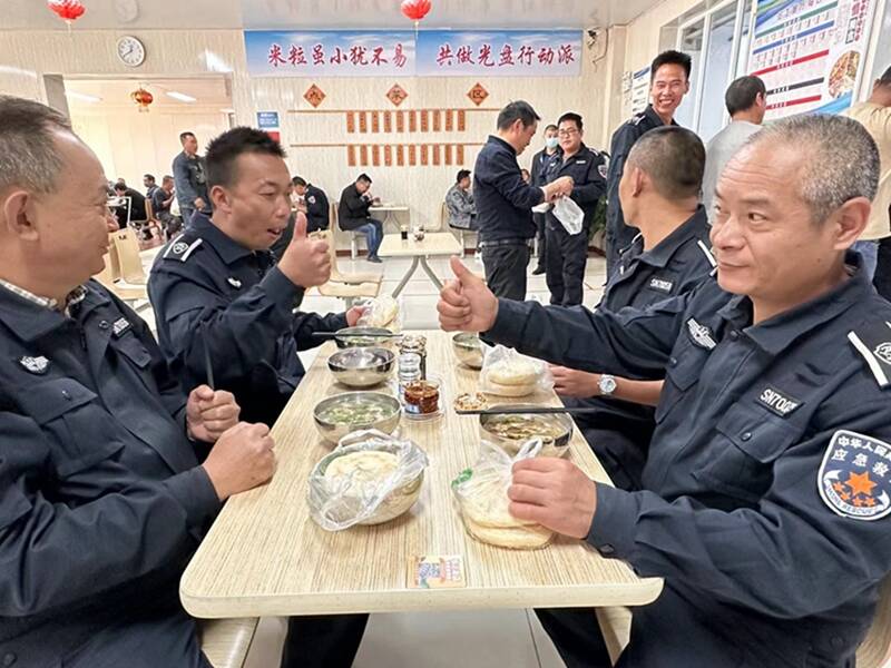 ▲硫磺沟煤矿职工品尝完免费的羊肉汤后纷纷竖起大拇指 梁铁 摄
