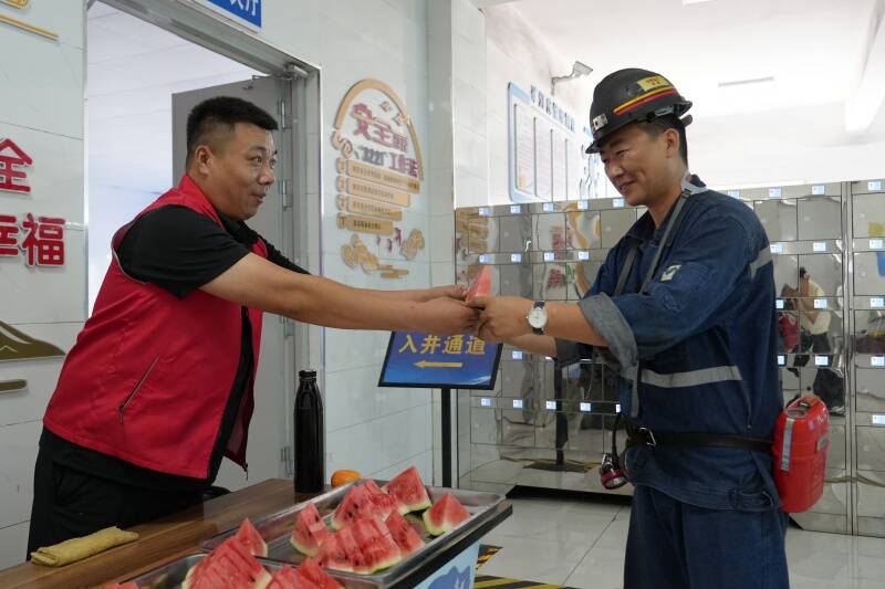 西瓜的供应不仅局限于宿舍,职工上下班也能吃到。在井口处,该公司设立的“清凉驿站”成为职工交接班时的“打卡地”。身穿红马甲的志愿者们将切好的西瓜整齐码放在托盘中,清甜的瓜香四溢。“师傅,吃块西瓜解解暑!下井一定注意安全。”每当有职工升井或下井,志愿者便递上清甜的瓜果,同时送上温馨的安全嘱托。驿站还常备现煮绿豆汤、菊花茶等饮品供职工饮用,全方位帮助职工解暑。